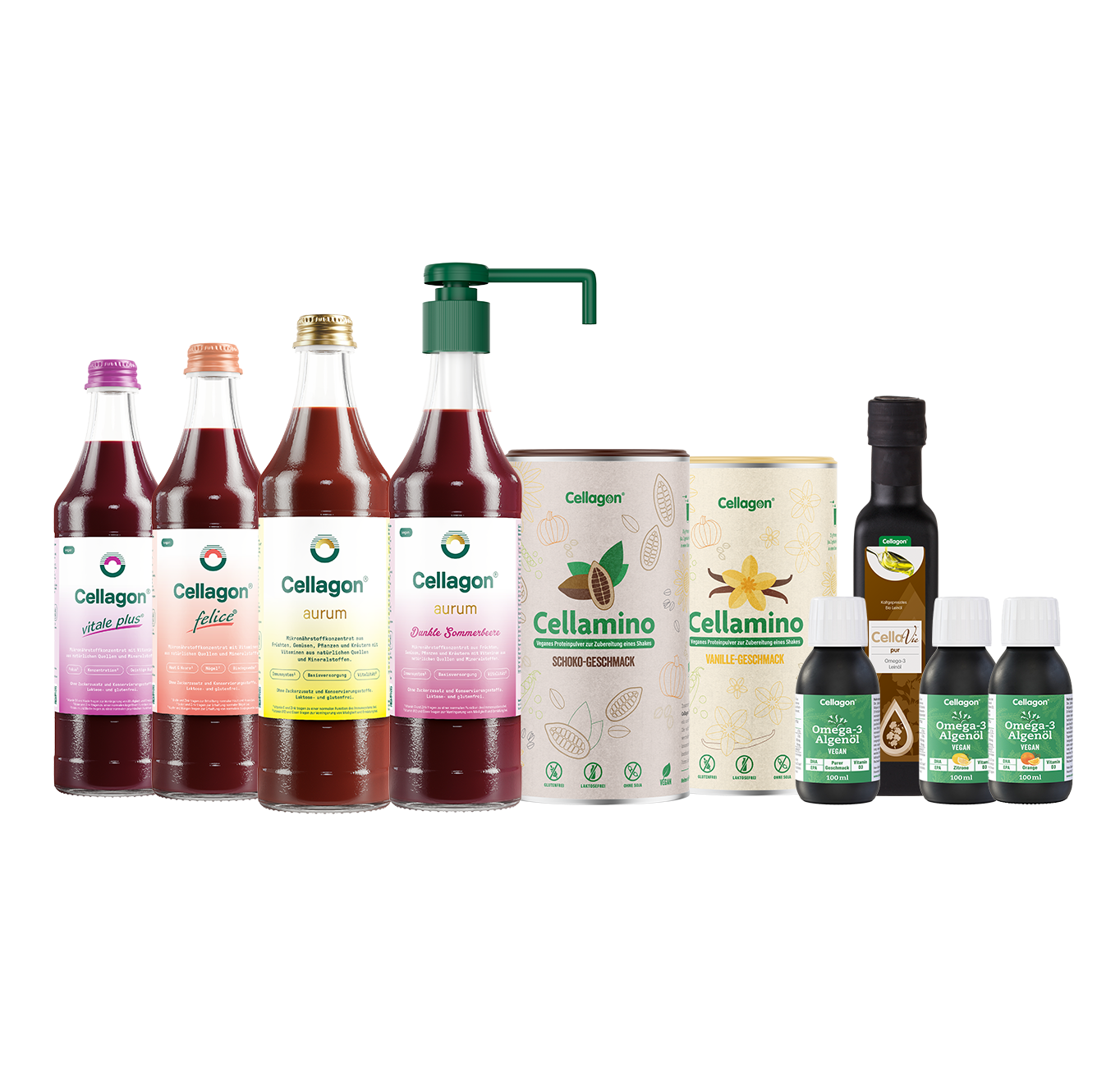 Enthalten sind je eine Flasche unserer Mikronährstoffkonzentrate Cellagon aurum, aurum Dunkle Sommerbeere, vitale plus und felice, je eine Portion unseres veganen Proteinpulvers Cellamino Vanille und Cellamino Schoko, je eine Flasche Omega-3 Algenöl Zitrone, Orange und Pur sowie eine Flasche Bio-Leinöl CellaVie pur.